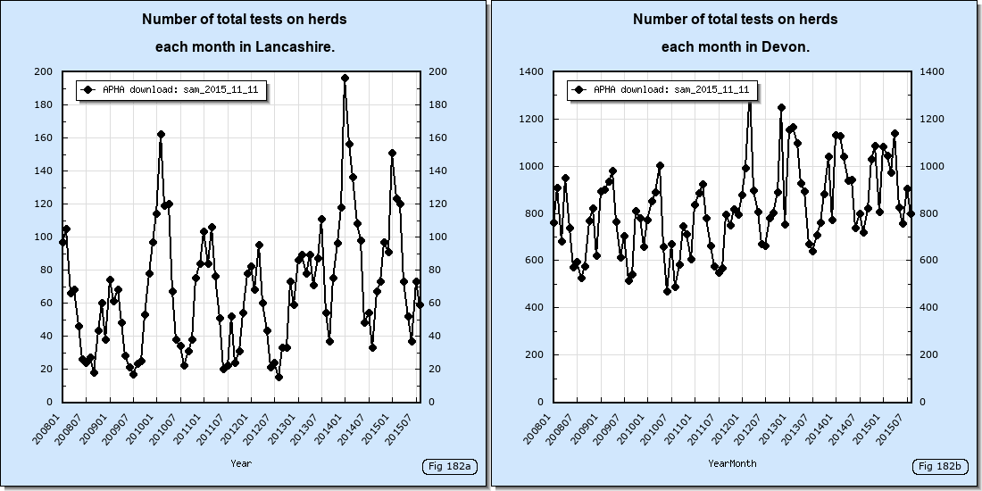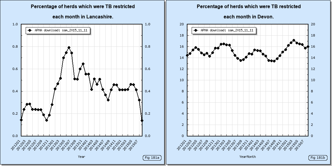 In Nov 2014 the percentage of herds which were TB restricted in Lancashire was about 0.5. In Devon that percentage was about 30 times greater at about 15. This is illustrated in the thumbnail below.