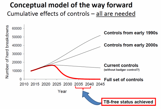 The very large number of "on" cattle movements in the counties of Lancashire, Cumbria and North Yorkshire and their very low number of TB restricted herds illustrate that in England there is weak correlation between the number of cattle movements and TB restricted herds in areas where badger TB is considered low. Since the 1980's, effort has been concentrated on tightening cattle controls. Unfortunately during this time TB levels have soared as can be seen in the thumbnail below.Collectively, this implies that in the fight to control TB in England, the potential impact for the additional cattle controls which have been and are destined to be introduced in the absence of widespread and effective badger culling in High Risk Areas [current date 13Feb2015] will be rather limited. In 2013/14 the DEFRA budget for developing culling methods was only 1% of the budget targeted at vaccination options.10,11 In November 2014 the Chief Scientific Adviser for DEFRA, Professor Ian Boyd, presented a slide at a Bovine TB Science Conference which showed the following schematic.7 Note the limited progress which is expected without badger control.