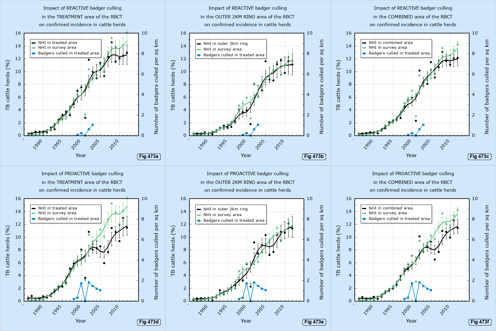 The following graphs show the impact of reactively and proactively culling badgers in the RBCT on TB incidence using data supplied by DEFRA in March 2016 in response to Freedom of Information Request ATIC0693.2,3The above graphs show that incidence in the subject and survey areas leading up to the start of culling in 1998 closely overlaid. If it is assumed that any differences were largely due to sample error, which cannot be adjusted for, it is appropriate to calculate the number of incidents prevented by simply subtracting the number of incidents in the survey areas from the number in the subject areas. Between 1998 and 2012, in the combined proactive treated area and outer 2km ring, the sum of incidents recorded in the raw unsmoothed data supplied by DEFRA reveals that, relative to the sum in the combined survey-only areas, 2706 - 2378 = 328 incidents were prevented. 1,132 km2 was the overall encompassed treatment area, of which 797 km2 were accessible for treatment. Hence if each incident costs £30,000, the benefit per km2 of treatment area was 30,000 * 328 / 1,132 = £8,692.58.
