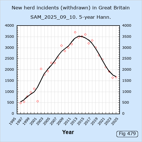 According to statistics on TB in cattle released by DEFRA each month about 3,300 new herd incidents which resulted in OTF status being withdrawn (simply referred to as TB incidence below) occurred in 2013 and 2014 in Great Britain.