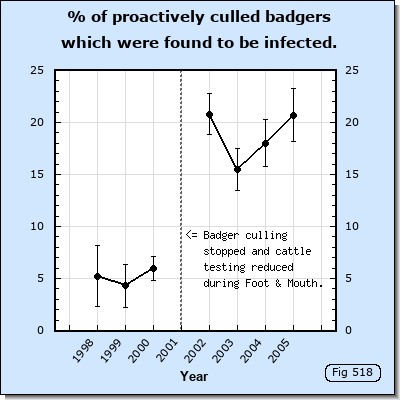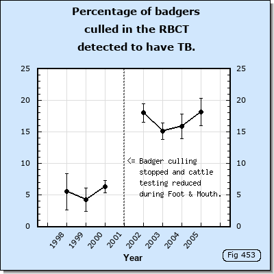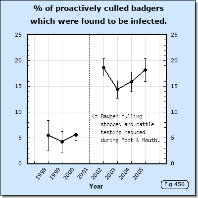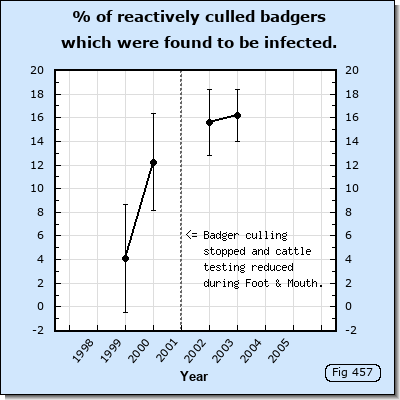 As noted in the previous section, the percentage of badgers detected to be infected suddenly tripled between 2000 and 2002 during the lull in culling caused by Foot and Mouth. This sudden increase in detection is huge. It is unlikely that infection in cattle would have increased and would have transmitted to badgers to cause prevalence in badgers to triple in just 12 months.