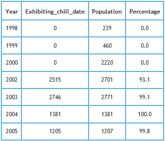 In modelling TB infection in badgers, data were initially supplied by DEFRA. If that data matched that supplied in response to ATIC124810,11, that supplied data was more detailed and included dates unlike the data on which the model was based. Dates which are perhaps important are the "initial chill date" and the "chill date". Such dates were added from 14th May 2002 onwards. The percentage of badger carcasses for which at least one of these dates were recorded in the data supplied by DEFRA is shown plotted and tabulated below.