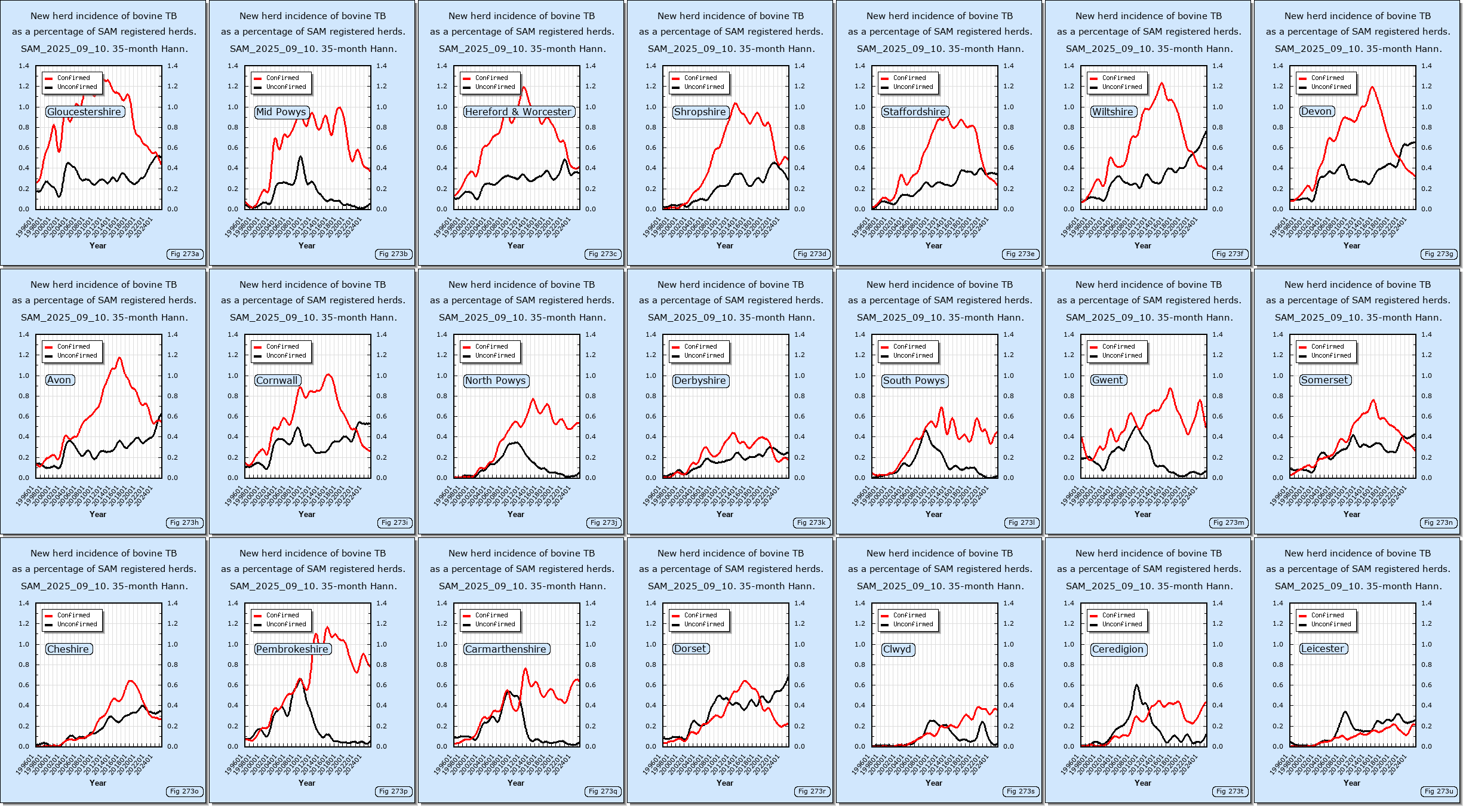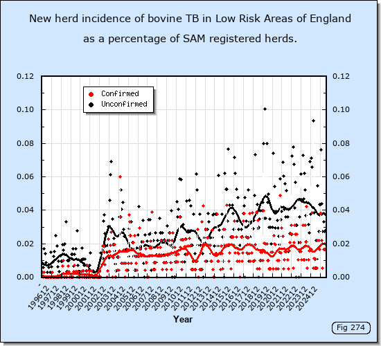 Having said all this, it is very striking how the confirmed proportion in Fig 269 is much less in Wales than it is in England. Although the amount of testing in Wales started to ramp up more than in England from about 2008 onwards, the relatively low proportion of confirmed incidents in Wales before 2008 suggests that Wales had (and perhaps still has) a smaller badger problem than in England. A history of testing regime changes in Wales is described in Reference 6.