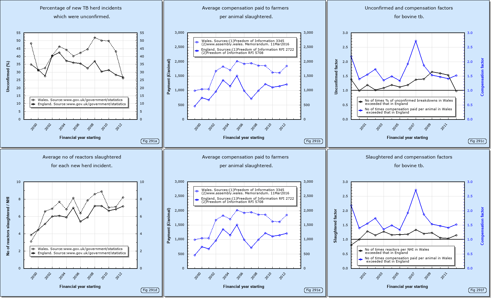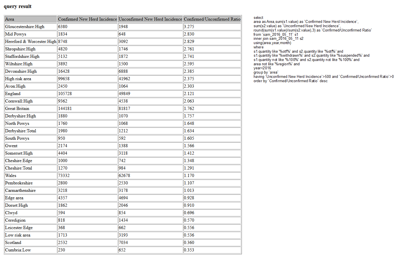 The following graphs show confirmed and unconfirmed incidents in counties of England and Wales in descending order of confirmed to unconfirmed breakdown ratio. This order was determined by querying the APHA SAM May 2016 download and summing all herd incidences between Jan 1996 and Dec 2015. Click here to see the database query (MySQL) and the results returned. Click the thumbnail below to see the graphs at full size.Note the small confirmed proportion in Somerset, Dorset and Pembrokeshire. Somerset and Dorset are 2 of the 3 counties where badger culling is currently taking place in England (May 2016). Pembrokeshire is the county in Wales where badgers are being vaccinated as part of the added measures in the Intensive Action Area. Although there are many contributing factors which reduce the meaning of these graphs, the above graphs suggest that these counties have not got a badger population in which badger-to-cattle TB transmission has been particularly high. If the areas selected in each county do not stand out from the situation in the rest of the county, this raises the question of whether these areas should have been singled out for addressing badger TB. For instance in Wales, if the confirmed proportion is an indicator of the strength of badger-to-cattle transmission, it may have been better to have selected an area in Mid Powys than an area in Pembrokeshire. Click on the thumbnail above to clearly see Figs 273b and 273p which shows the disease profiles in these 2 counties.