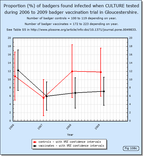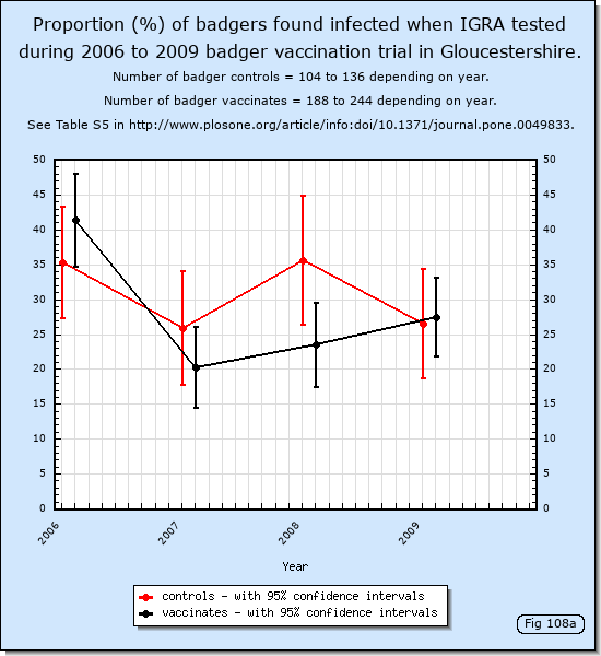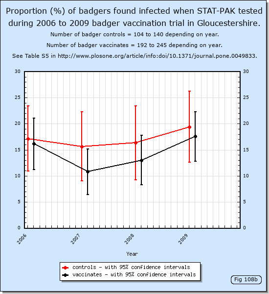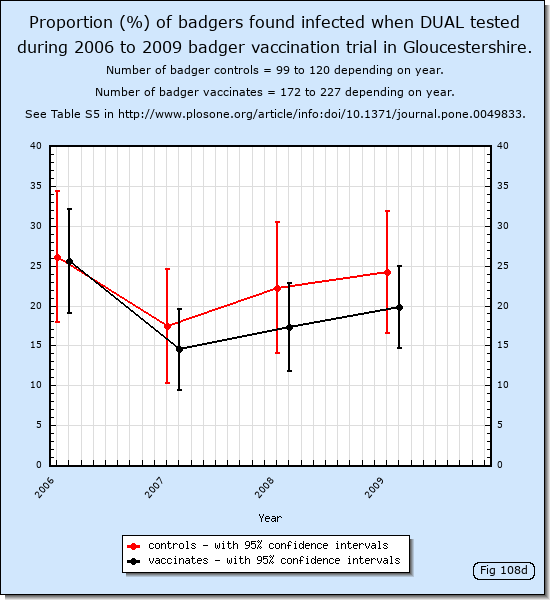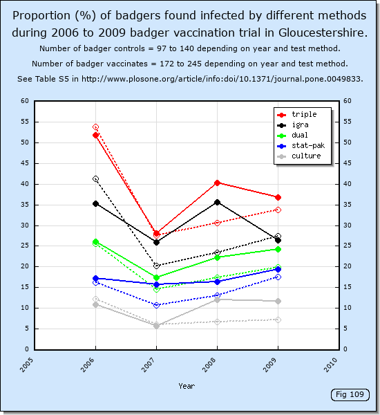 Fig 108e, which shows results using the most thorough test combination (the triple test), shows that a very high proportion of badgers were found to be infected. In fact, in 2006, infection was detected in 53% of the 112 badger controls tested. This proportion is much bigger than the proportion of cattle in which infection is detected. In fact, in the worst affected counties of South West England this proportion is less than 2% (see here) so is less than one twenty fifth of that found in this subset of badgers. However prevalence in badgers was only measured in a small 55km2 area of Gloucestershire and this area is thought to be one of the worst affected areas in the country.