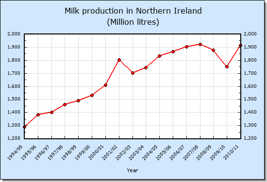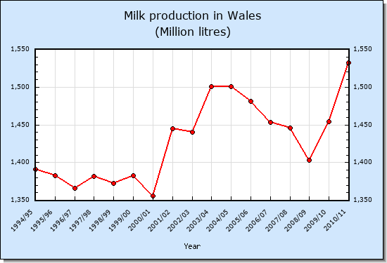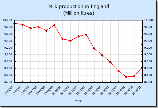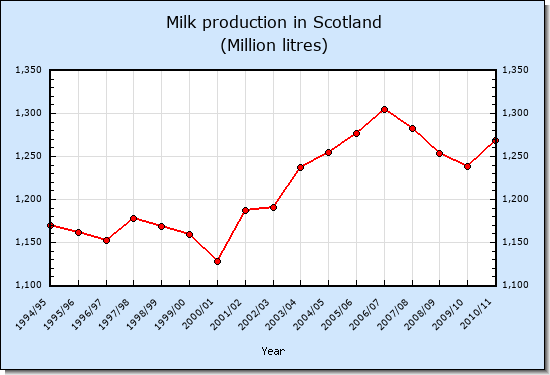 Data shown in the graphs below were downloaded from References 1, 2 and 3. Data prior to 2004/05 was derived from net quota. During this period production closely followed quota. In the last 10 years milk production in Wales and Scotland has increased and has clearly reduced in England. This is largely because of the greater extent to which government policy in England has decoupled subsidy from production and given it to environmental schemes. Further details are given in Reference 4.References