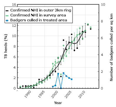 The following graph has been extracted from a report stamped "Confidential - Report to Defra". That report reports on work carried out from 2011 to 2013 in DEFRA project SE3279 titled "Further statistical analysis of the Randomised Badger Culling Trial".