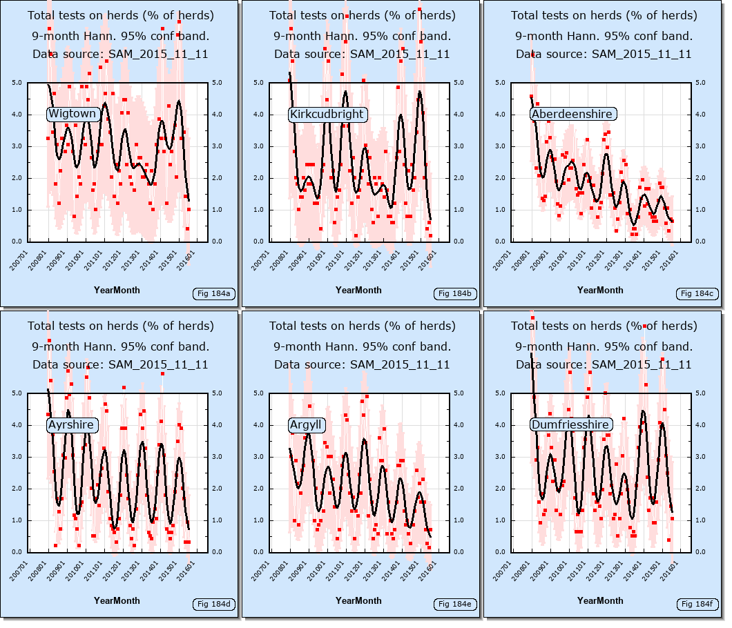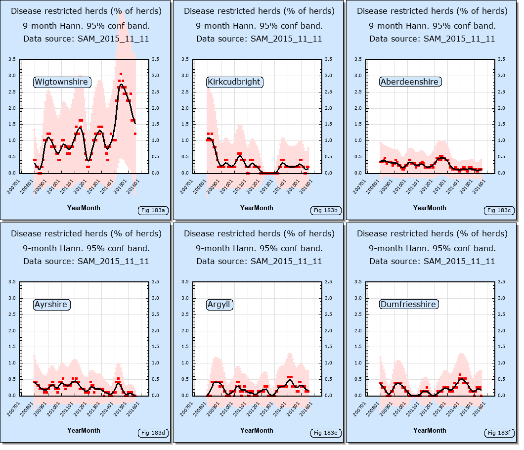 The number of TB disease restricted herds in Wigtown (which exclude restrictions imposed due to late tests) are shown for each month since Jan 2008 in the thumbnail below. Click on it to see the graphs clearly.