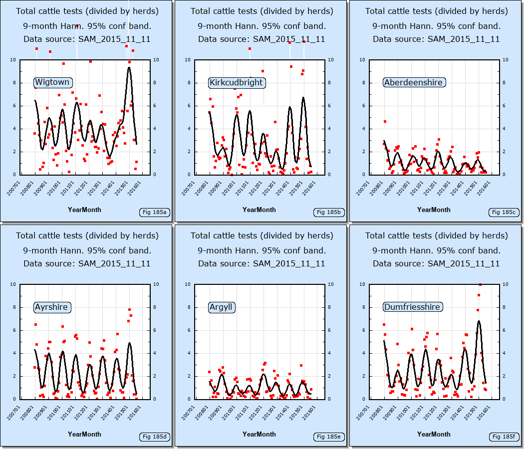 The graphs shown above, show the top 6 counties in Scotland for percentage of TB restricted herds (prevalence) for all counties for which the accumulated number of TB restricted herds in the county from Jan 2008 to Dec 2014 exceeded 100. Apparently the number of TB herds in Wigtown has exceeded by a large margin that in any other county since Jan 2009 and increased sharply in 2014.