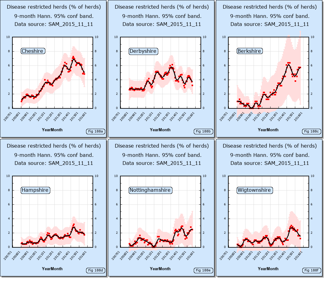 The following thumbnails compare the proportion of herds which are disease restrcited in English edge counties with those in Wigtownshire.