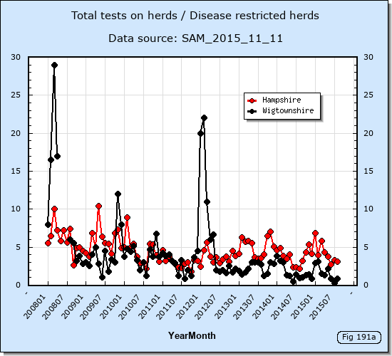 Evidently more tests for each disease restricted herd were performed in Hampshire in 2013 and 2014 than in Wigtownshire. These disease restricted herds do NOT include herds restricted due to late testing.