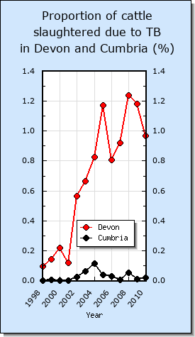 Shown below are graphs which shows the impact of this restocking on bovine TB in Devon and Cumbria and what has been happening