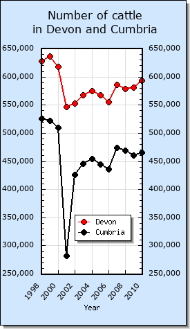 in subsequent years. Cumbria was by far the worst affected county where Reference 14 reports that 209,106 cattle were slaughtered due to Foot and Mouth.