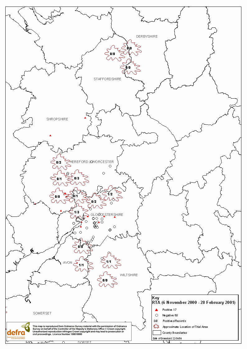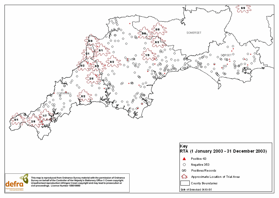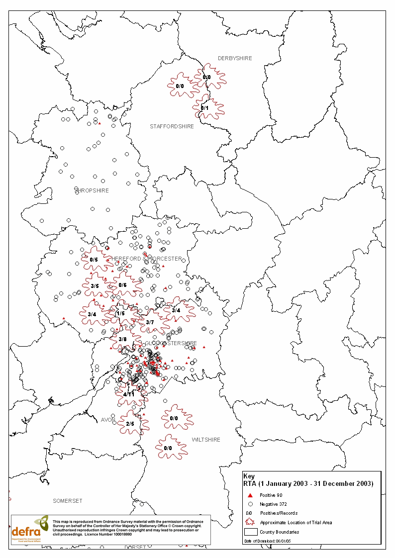 Dispersal of different spoligotypes to remote locations is thought to be due to cattle to cattle transmission. However it is a concern that wildlife sanctuaries are releasing a small number of badgers each year to new locations. Also a large number of traps went missing during the Random Badger Culling Trials and these traps may have contained badgers which were relocated to areas outside the culling zones. In fact, between December 1998 and 10 October 2003, 1827 cages were removed9. Culling during these trials started in 1998 and ended in October 2005.